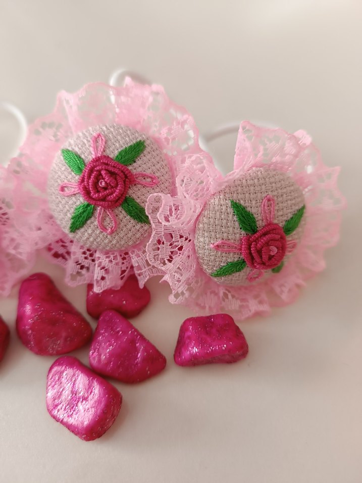 Pembe dantelli, nakışlı çiçek detaylı çocuk saç tokası. Renkli ve bohem tarzda, zarif tasarım.
