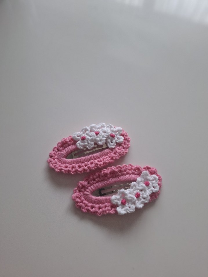 Pembe renkte, dantelli ve nakışlı çiçek detaylı çocuk tokası seti, renkli ve klasik bir stile sahiptir.