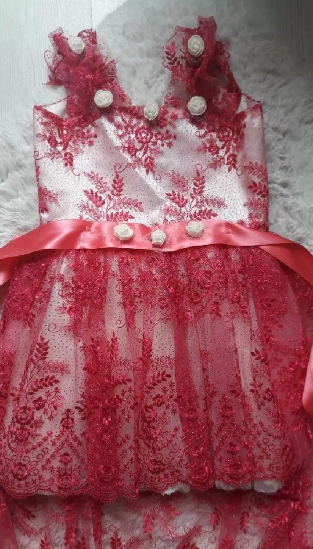 Dantelli ve nakışlı desenlere sahip, askısız ve beli saten kurdeleli pembe kız çocuk elbisesi. özel dıkımdır