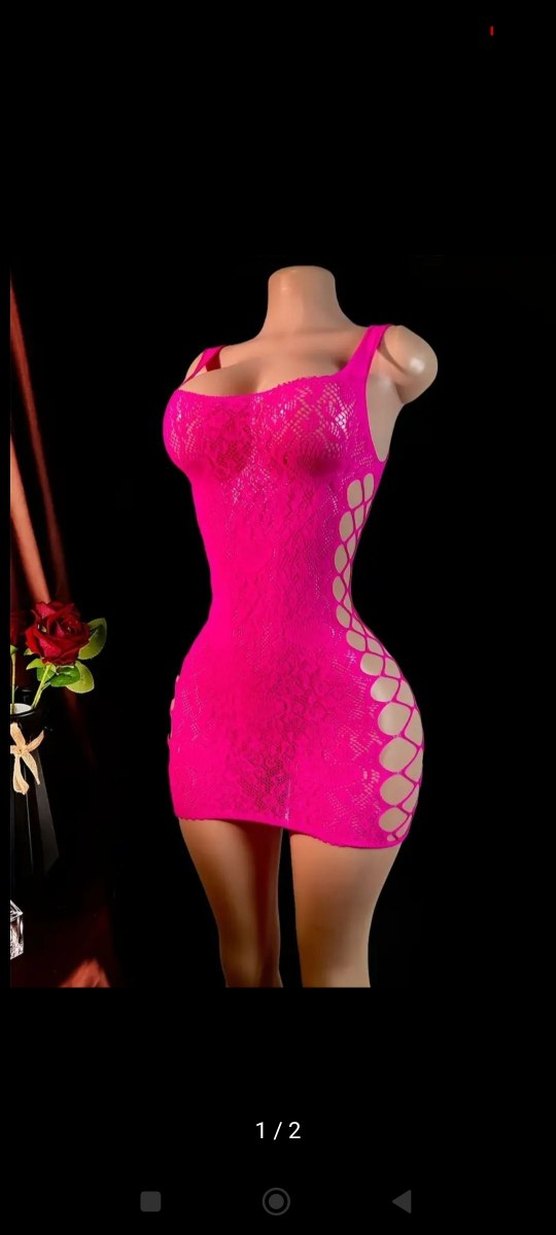Pembe dantelli, yılan desenli, askılı ve vücuda oturan mini elbise, gösterişli parti stiline uygundur.
