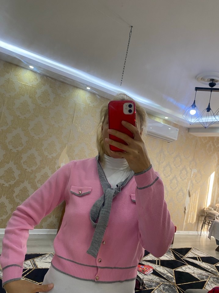 Pembe, dar kesim midi hırka, uzun kollu ve düğmeli. Yumuşak ve sıcak dokusuyla günlük sokak stiline uygun, pastel tonlu şık bir parça.
