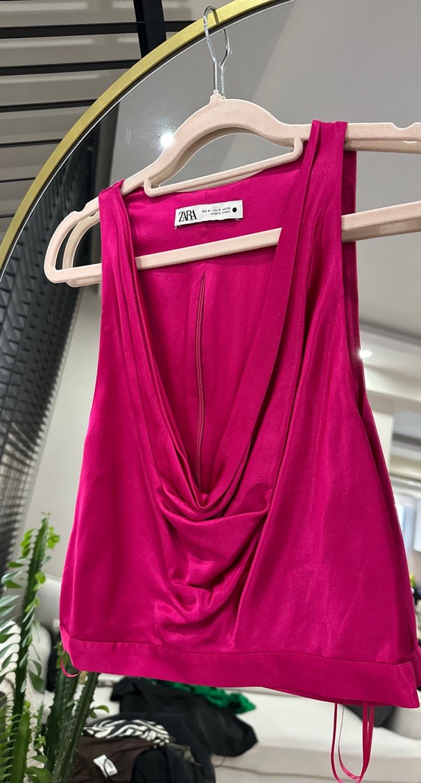 Pembe renkte, drapeli V yakalı, kısa ve bol kesim mini atlet. İpeksi kumaştan, parlak baskılı ve "ZR" etiketi taşır. Streetwear ve athleisure tarzına uygundur.