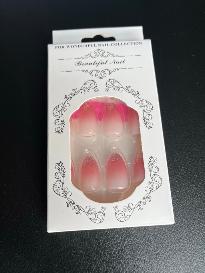 Pembe degrade renkte, parlak yüzeyli yapay tırnak seti. Pakette "FOR WONDERFUL NAIL COLLECTION" yazısı yer alıyor.