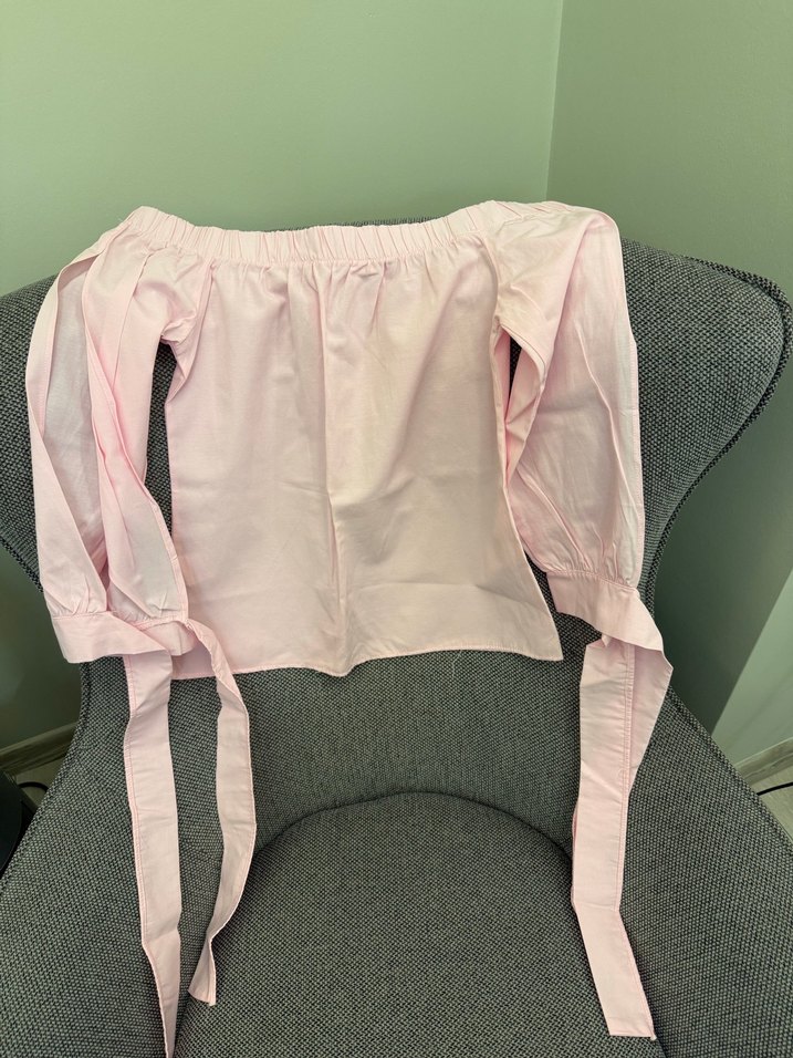 Pembe renkli, kayık yaka detaylı, uzun askılı kollara sahip bol kesim bluz.