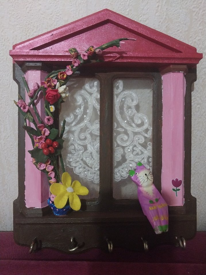 Pastel pembe renkte, ev şeklinde dekoratif anahtarlık askısı. Çiçek detayları ve küçük kedi figürü bulunur. Üç kanca ile anahtar asılabilir.