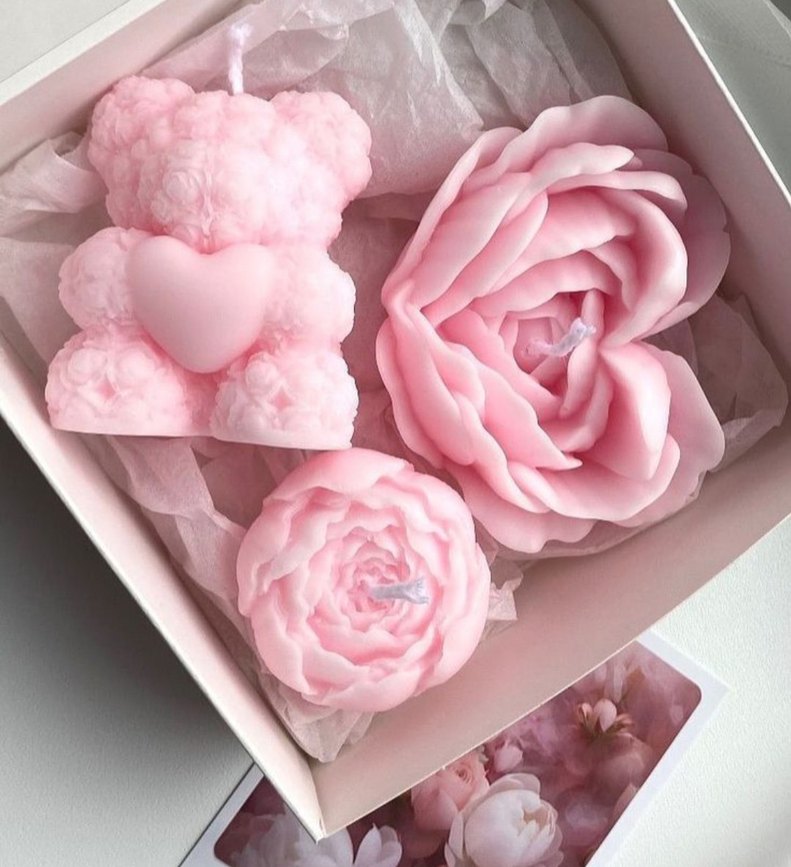 Üçlü pastel pembe kokulu mum seti, ayıcık, gül ve çiçek şekillerindedir. Mekâna yumuşak ve şirin bir hava katar. ️ İstenilen renk ve adet de hazırlanır Mumlarımız soyawaxtır Tamamen doğal ve bitkisel üründür