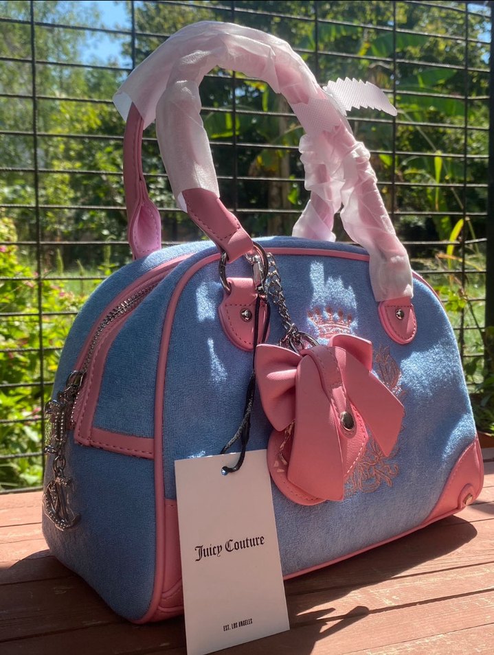 Fermuarlı kapama, baskılı desen ve fiyonk detaylı pastel pembe denim kadın çantası. Juicy Couture marka, trend sokak stili için uygun.