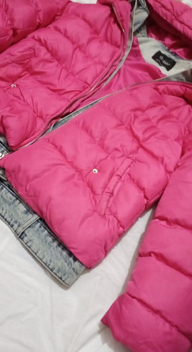 Fermuarlı önden kapamalı, parlak pembe renkli, denim kumaştan yapılmış kadın kışlık mont. Notch yakalı ve askılı kollu, trend sokak stili için uygun, normal midi boyda rahat bir model. ❄️