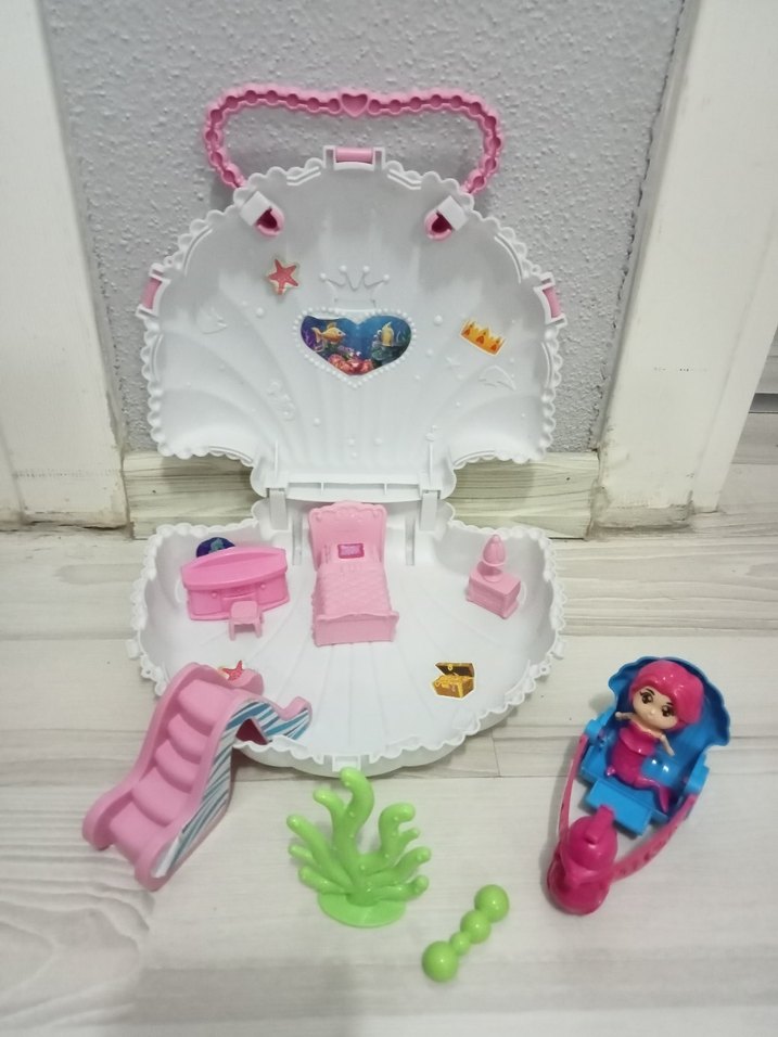 Pembe deniz kabuğu şeklinde oyuncak seti, küçük bebek, kaydırak, sandalye ve aksesuarlar içerir. Taşıma sapı ve renkli deniz teması vardır.