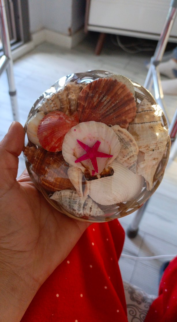 Çeşitli deniz kabukları ve pembe deniz yıldızı içeren şeffaf tasarımlı dekoratif vazo. Mekanlara deniz esintisi katar.
