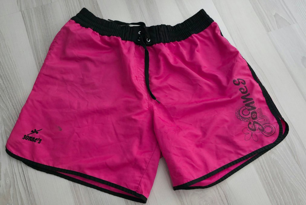 Canlı pembe renkte, düğmeli ve siyah bel bantlı, bol kesim deniz şortu. Sentetik kumaştan üretilmiştir.