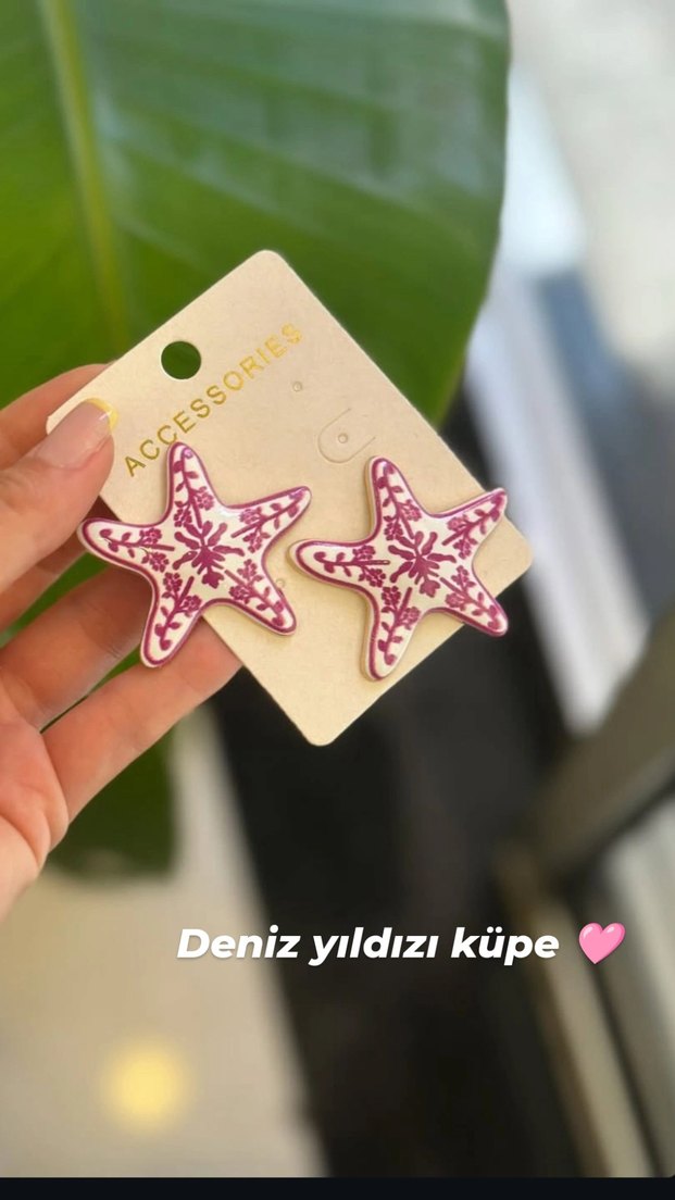 Renkli baskılı desenli, boncuk detaylı kısa pembe deniz yıldızı küpe, bohem plaj tarzı için uygun.