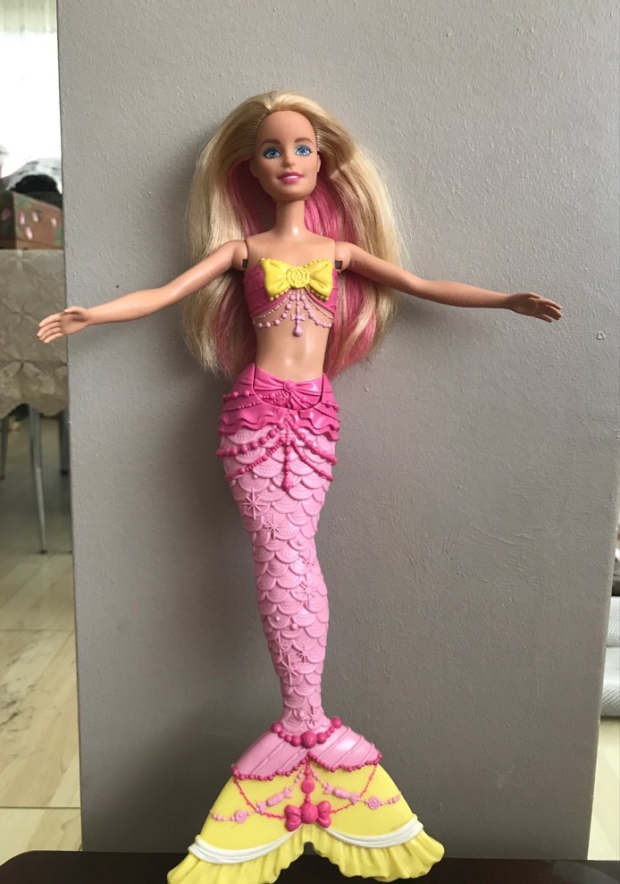 Lisanlı Barbi bebek , sarı fiyonkdetaylı üst ve süslü kuyruk yüzgeci saçları yıpranmamış temiz.