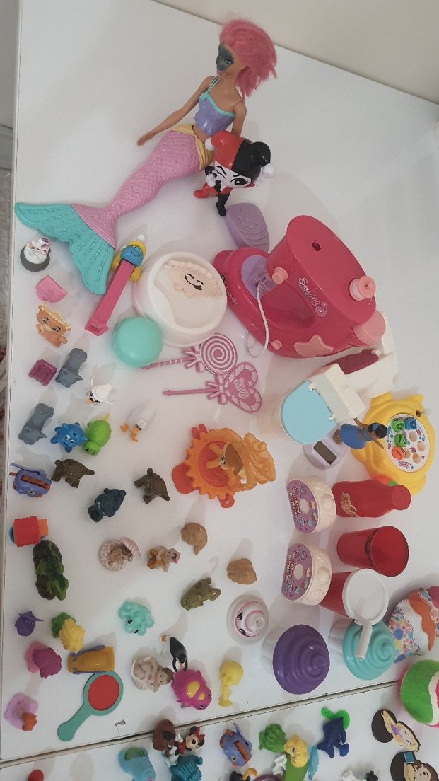 Pembe denizkızı bebek, küçük hayvan figürleri ve renkli oyuncak aksesuarlarından oluşan çeşitli oyuncak seti. Hayal gücünü destekler. ♀️