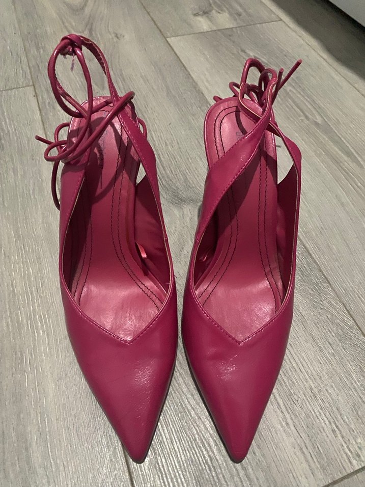 Koyu pembe deri, bağcıklı stiletto topuklu, sivri burunlu ve çağdaş tasarımlı kadın ayakkabı, romantik akşamlar için uygun.