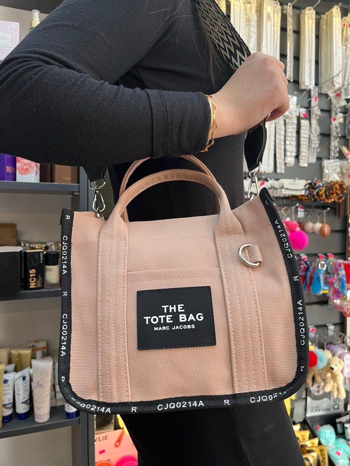 Pastel pembe deri tote çanta, baskılı detay ve tokalı tasarıma sahiptir. Marka logosu ve yazılı çıkarılabilir askı ile tamamlanmıştır.