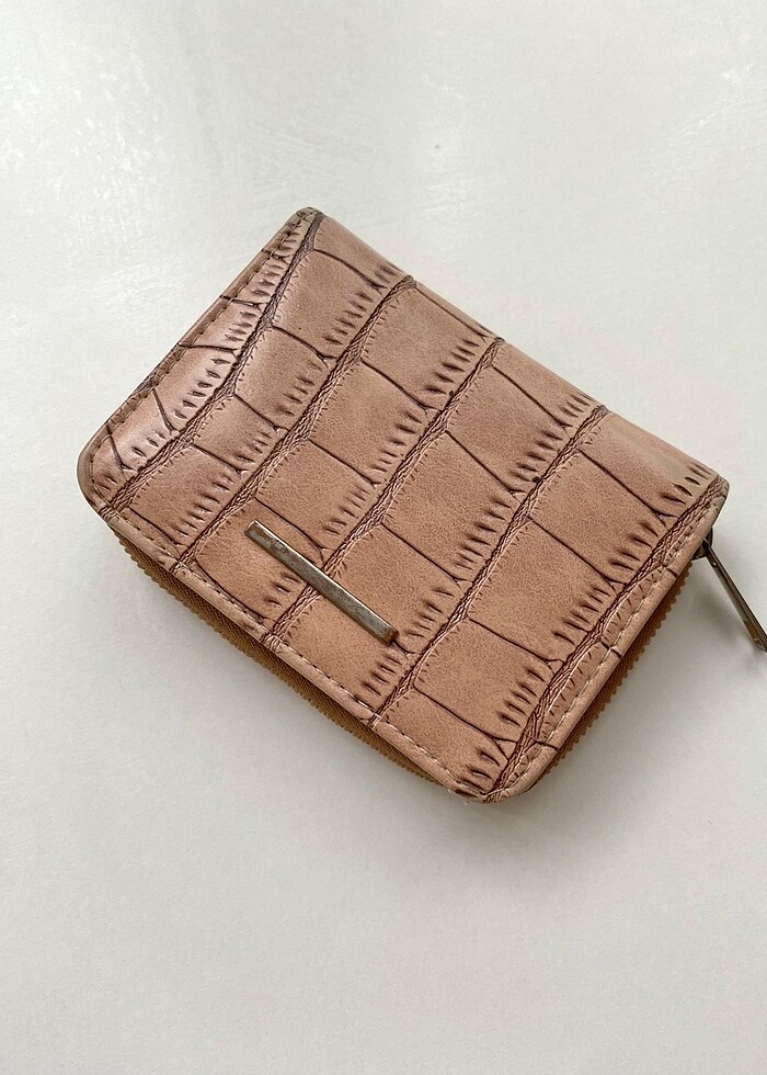 Pembe deri cüzdan, pudra rengi, fotoğraflarda defosu mevcuttur. Küçük kare şeklinde.