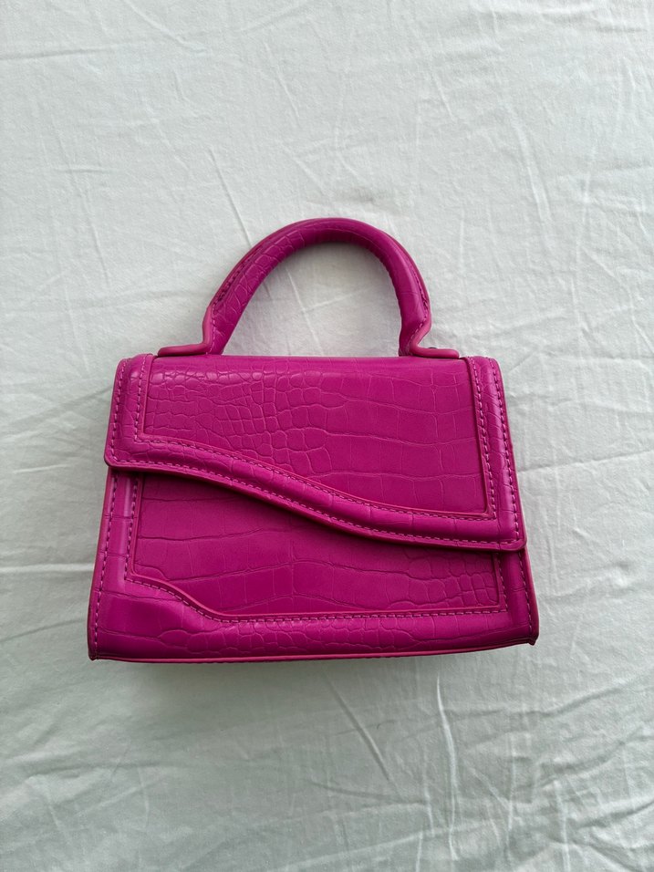 Pembe deri, yılan deseni ve tokalı kapak detayına sahip cesur ve çağdaş tarzda kadın çantası. Sorunsuz tertemiz