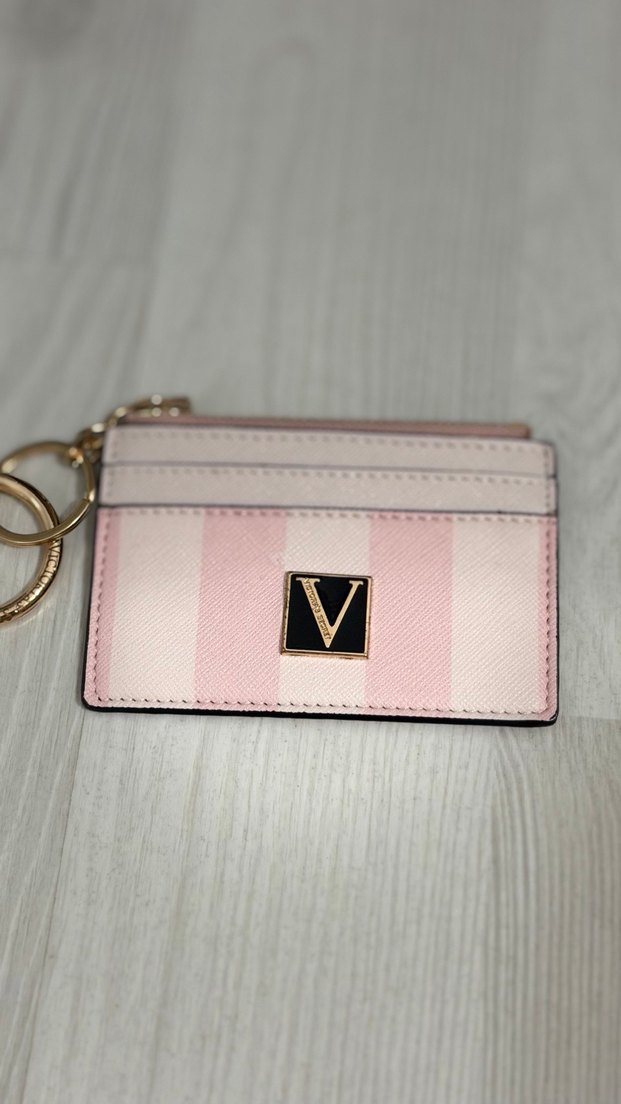 Pastel pembe deriden yapılmış, baskılı desenli ve fermuarlı kadın cüzdanı. Altın tonlu 'V' amblemi ve anahtarlık detayı bulunur. Günlük kullanım ve sokak modasına uygundur.