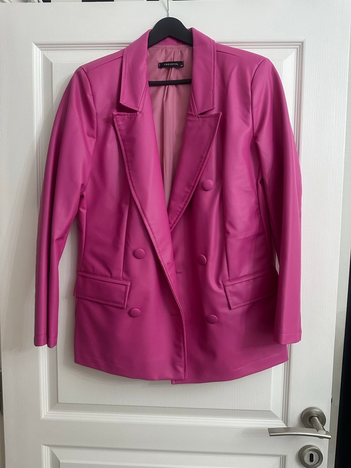 Pembe deri kadın blazer ceket, yakalı ve düğmeli ön detaylıdır. Parlak yüzeyli, normal uzunlukta ve strappy kolludur. Cesur stil ve ofis için uygundur.