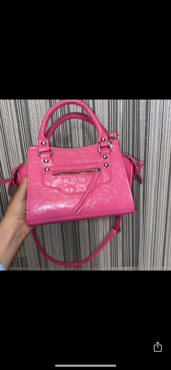 Canlı pembe deri kadın çanta, fermuarlı cep ve baskılı detaylara sahip. Cesur rock punk tarzıyla günlük kullanıma uygun, Paris havası taşıyor.