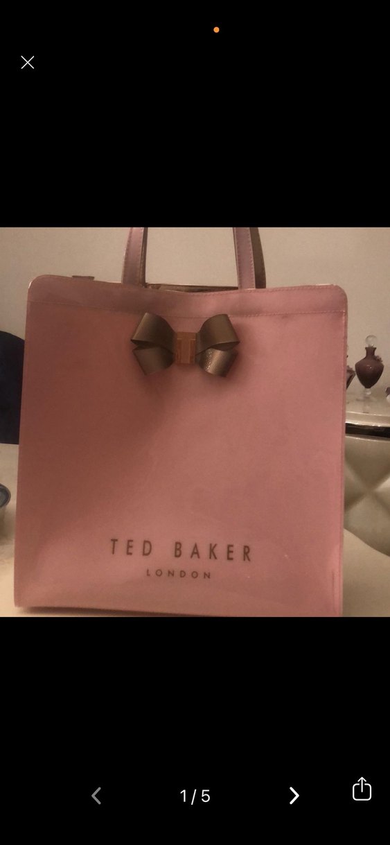 Pastel pembe deri kadın çanta, fiyonk detayı ve baskılı Ted Baker London logosu ile çağdaş ve şık tasarıma sahip.