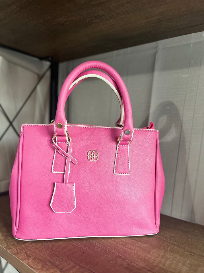 Canlı pembe renkte, tokalı kulplara sahip deri kadın çantası. Günlük kullanıma uygun çağdaş baskılı tasarım. -sıfırdır-paketlidir