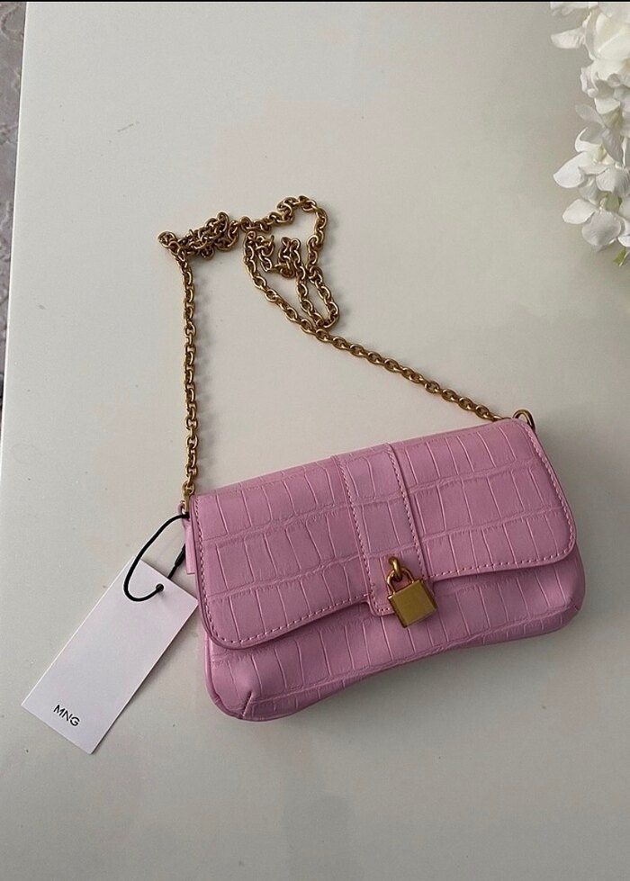 Pastel pembe deri kadın çanta, yılan desenli ve tokalıdır. Altın zincir askıya sahip, trend sokak stili için uygundur.