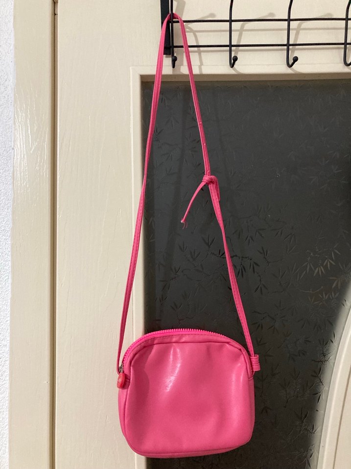 Pembe deri çapraz çanta, fermuarlı ve desensiz tasarımıyla günlük sokak stiline uygun. Askısındakini kendim bağladım koptığu için ama kendiniz bile evde dikebilirsiniz