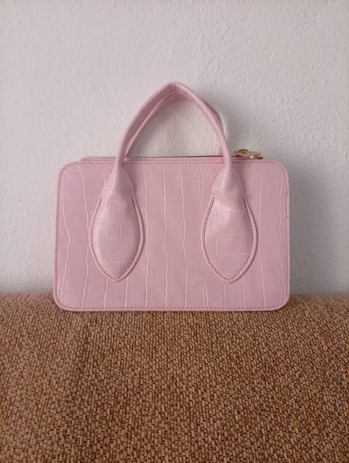 Pastel pembe deri el çantası, fermuarlı kapama ve çağdaş tasarıma sahip. Günlük kullanıma uygun, desen içermeyen şık Paris tarzı.