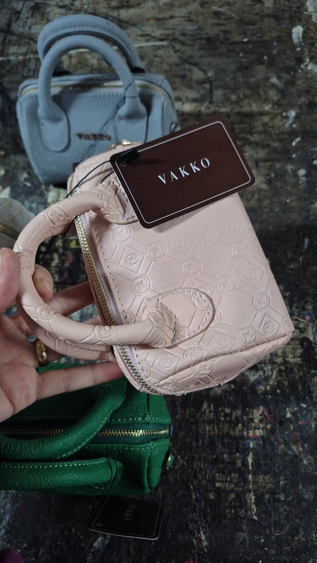 Pastel pembe deri, fermuarlı ve baskılı desenli kadın el çantası. 'VAKKO' etiketi taşır, trend sokak modasına uygundur.