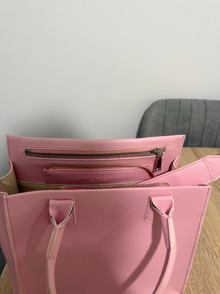 Pastel pembe renkte, fermuarlı ve minimalist tarzda deri kadın el çantası, günlük kullanıma uygundur.