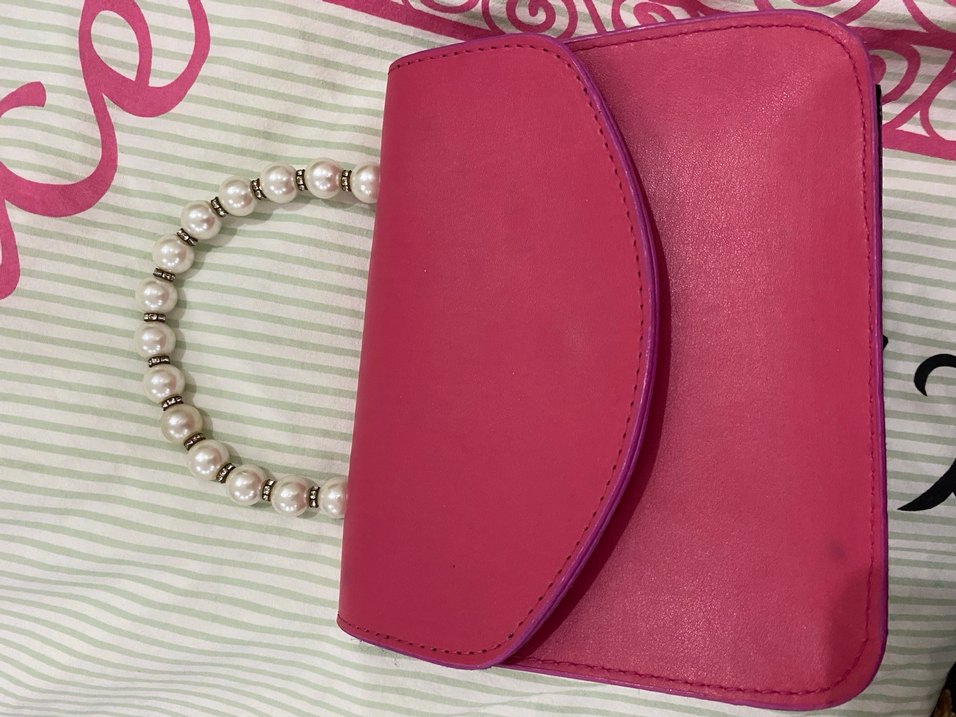 Pembe deri kadın el çantası, fermuarlı kapama ve renkli baskılı desene sahiptir. İnci saplı, genç trendsetterlar için çağdaş Paris tarzını yansıtır.