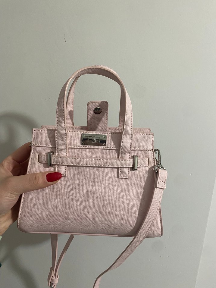 Pastel pembe deri kadın el çantası, baskılı desene ve kemerli tasarıma sahiptir. Günlük sokak stili için uygundur, saplar ve çıkarılabilir askı içerir.