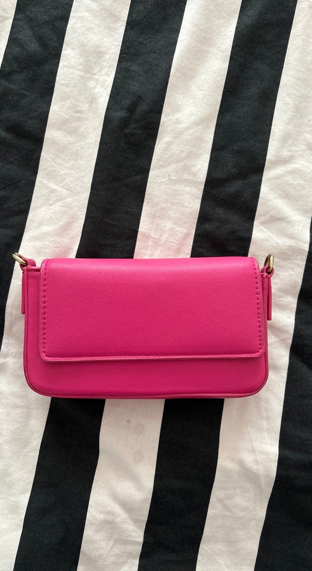 Pembe deri kadın omuz çantası, tokalı ve cesur tasarıma sahip. Günlük kullanıma uygun, Parisli tarzını yansıtıyor.