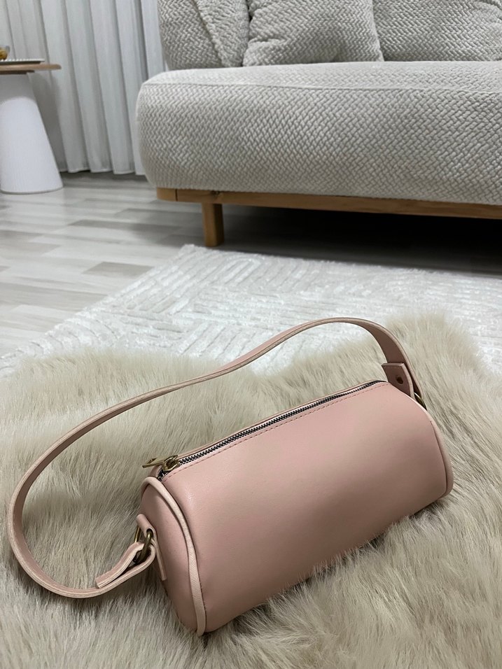 Pastel pembe deri kadın çantası minimalist tasarıma sahiptir. Sokak stili ve günlük kullanım için uygundur.