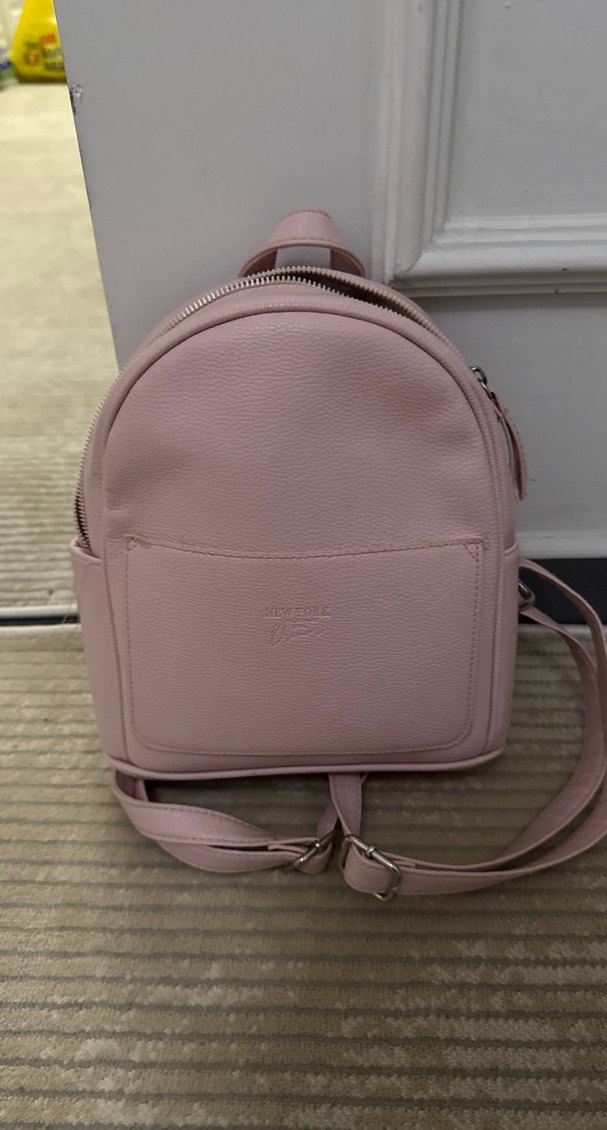 Minimalist pembe deri sırt çantası, tokalı detaylara sahip, günlük sokak stili için uygun, şık ve rahat bir tasarım.