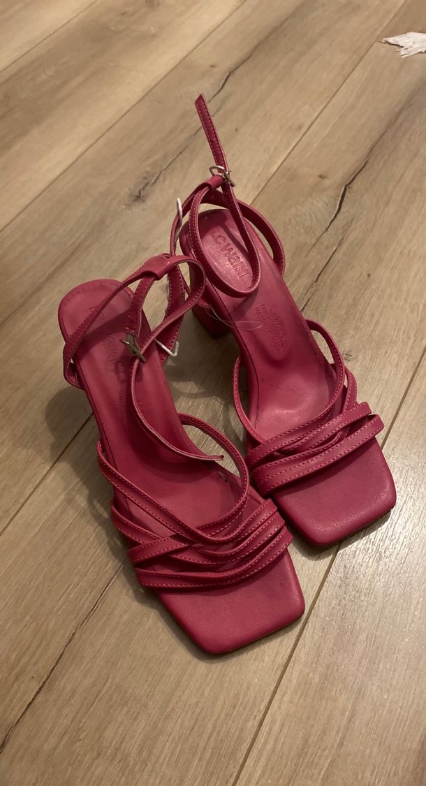 Pembe deri kadın sandalet, blok topuklu ve tokalı kayışlı, parlak yüzeye sahip. Cesur, bohem tarzıyla romantik akşamlar için uygun. Hiç giyilmedi resimde göründüğü gibi Kalıbı dar 37 numara gibidir