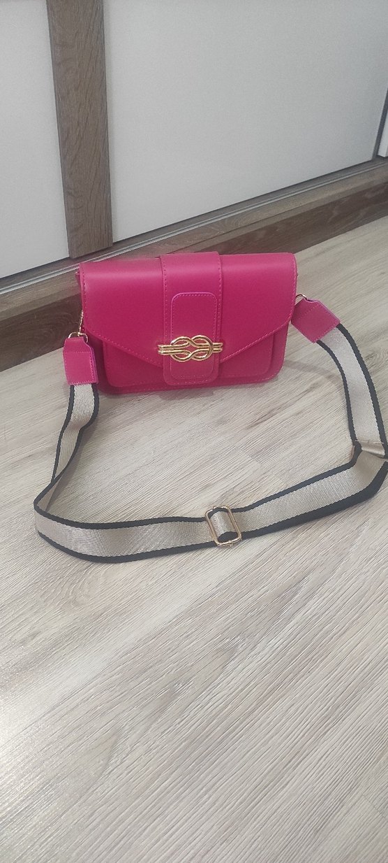 Pembe kadın çanta, altın kemer detayı ve ayarlanabilir askıya sahiptir. Modern klasik tarzıyla günlük kullanıma uygundur.