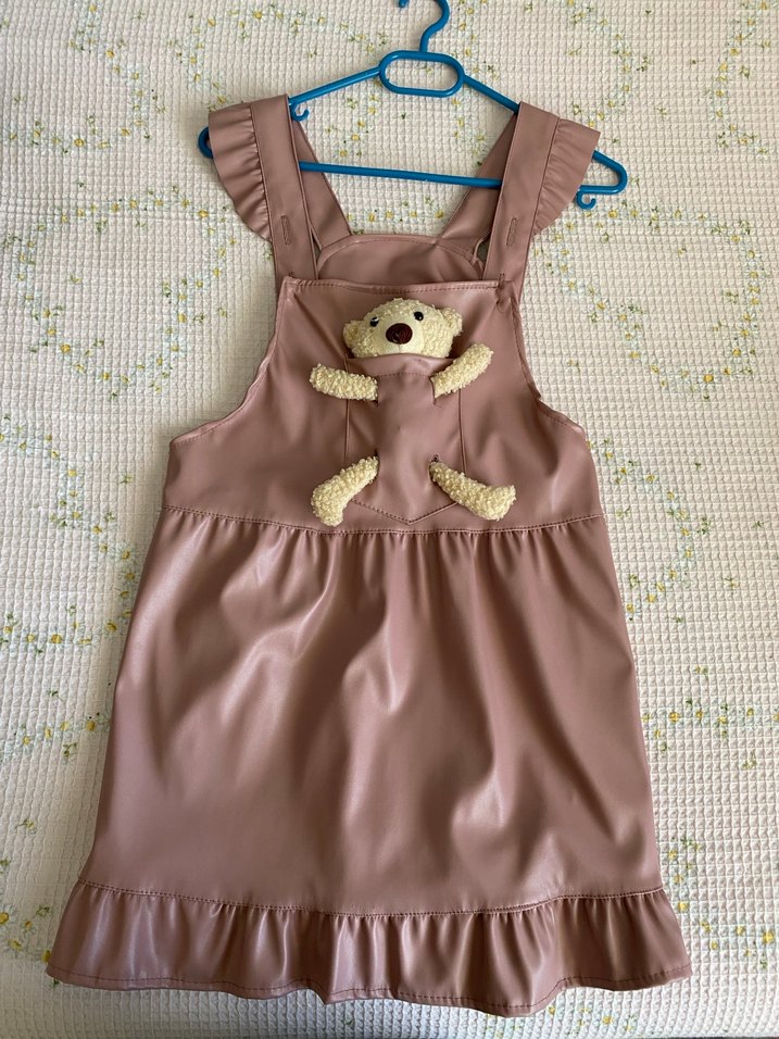 Pembe deri kız çocuk elbise, fırfırlı askılar, halter yaka ve bol kesimlidir. Önde oyuncak ayı detayı ve fırfırlı etek ucu bulunur.