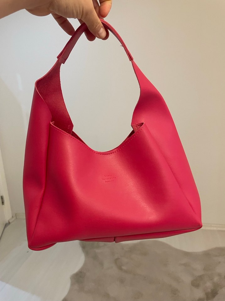 Pembe deri, desen içermeyen minimalist tasarımlı kadın çanta. Pastel tonları ve zahmetsiz şıklığıyla günlük kullanıma uygundur.