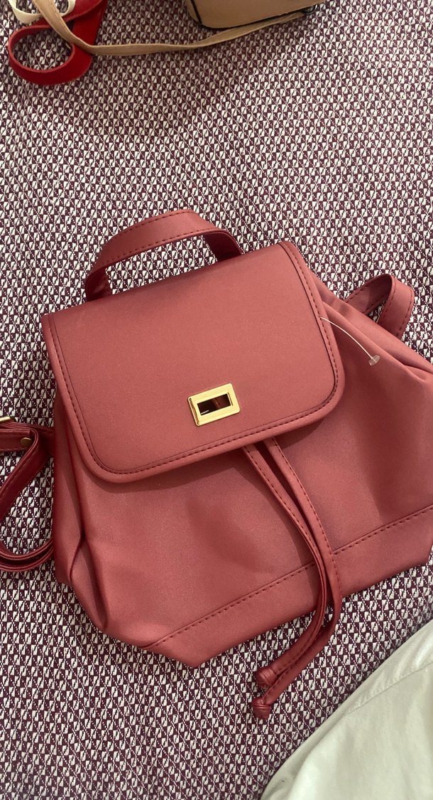 Parlak pembe deri sırt çantası, tokalı ve yılan desenli, trend sokak stili için uygun.