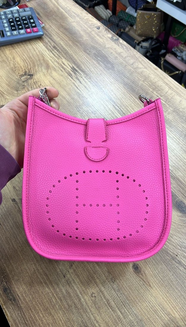 Pembe deri kadın çanta, tokalı kapama ve delikli 'H' deseni ile çağdaş ve renkli bir görünüm sunar. Günlük kullanım için uygundur. kampanya son kalanlar