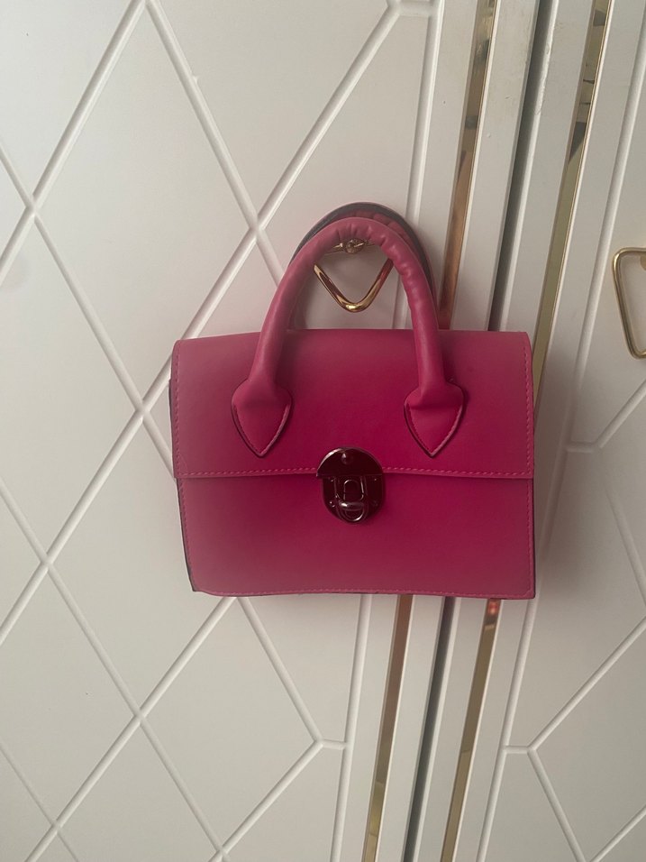 Pembe deri kadın çanta, tokalı kapama ve yapılı sapıyla modern klasik tarzı yansıtır. Günlük kullanıma uygundur.