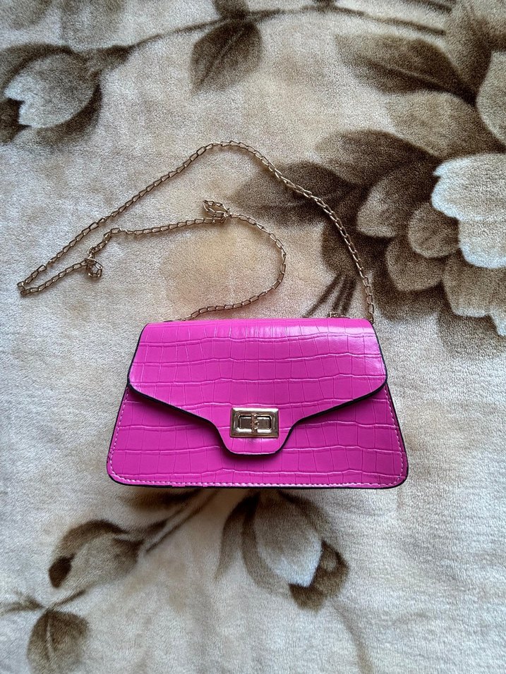 Pembe Deri Zincir Detaylı Yılan Desenli Çanta