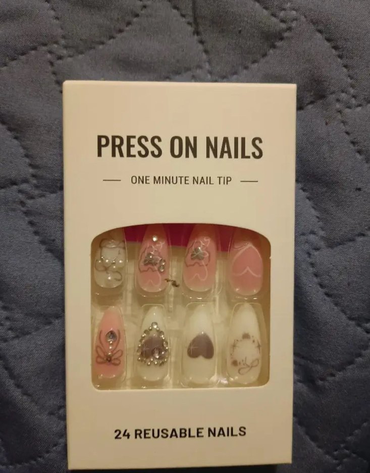 Pembe tonlarında, çeşitli zarif desenlere sahip, 24 yeniden kullanılabilir takma tırnak içerir. Bir dakikada kolayca uygulanabilir.