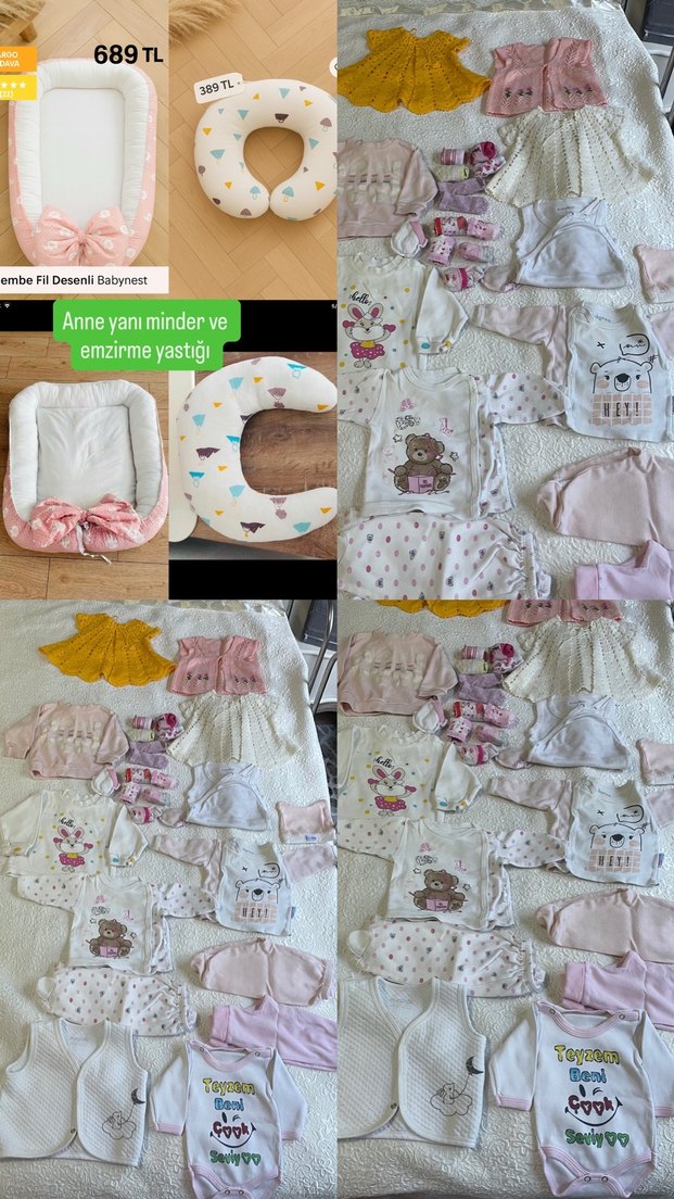 Yumuşak tekstil malzemeden yapılmış, pastel pembe desenli anne yanı minder ve emzirme yastığı seti, emzirme sırasında konfor sağlar. Kıyafetler toplu satış hepsi 500+500 tl şeklinde 1000 tl