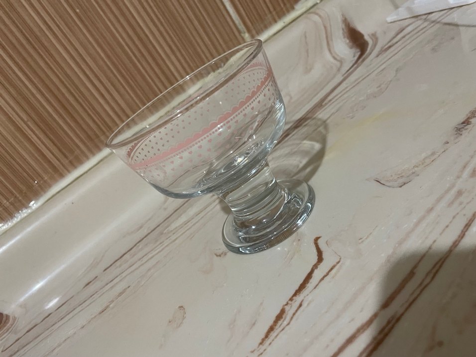 Pastel pembe desenli, ayaklı cam kase. Tatlı veya atıştırmalıklar için uygun. 6 adet