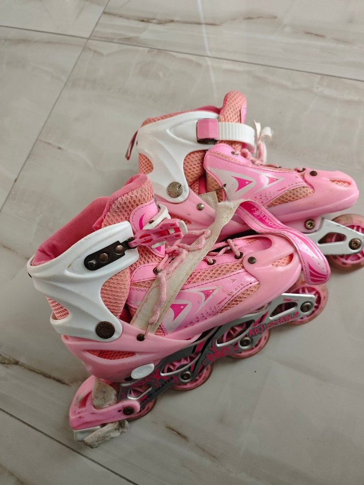 Pembe bağcıklı patenler, kauçuk tekerlekli ve spor ile street wear tarzı için uygundur. ⛸️ ayarlı büyütülen
