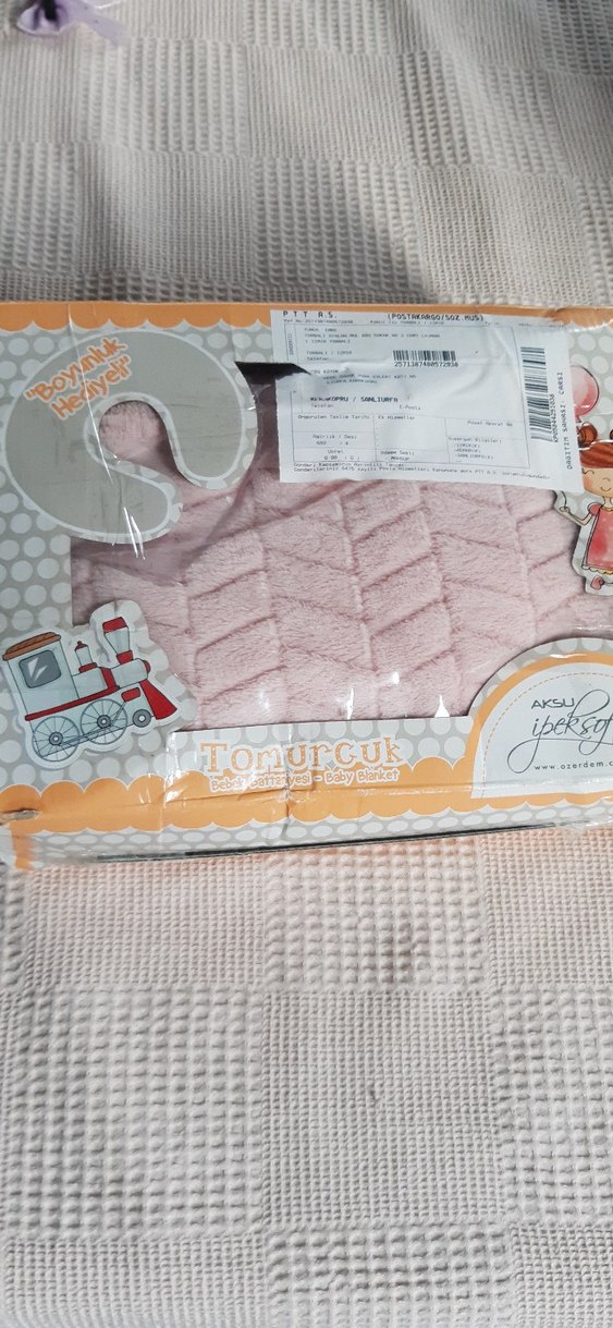 Yumuşak dokulu, pastel desenli pembe bebek boyun yastığı. Ambalajda 'ibekso' markası yer almaktadır.
